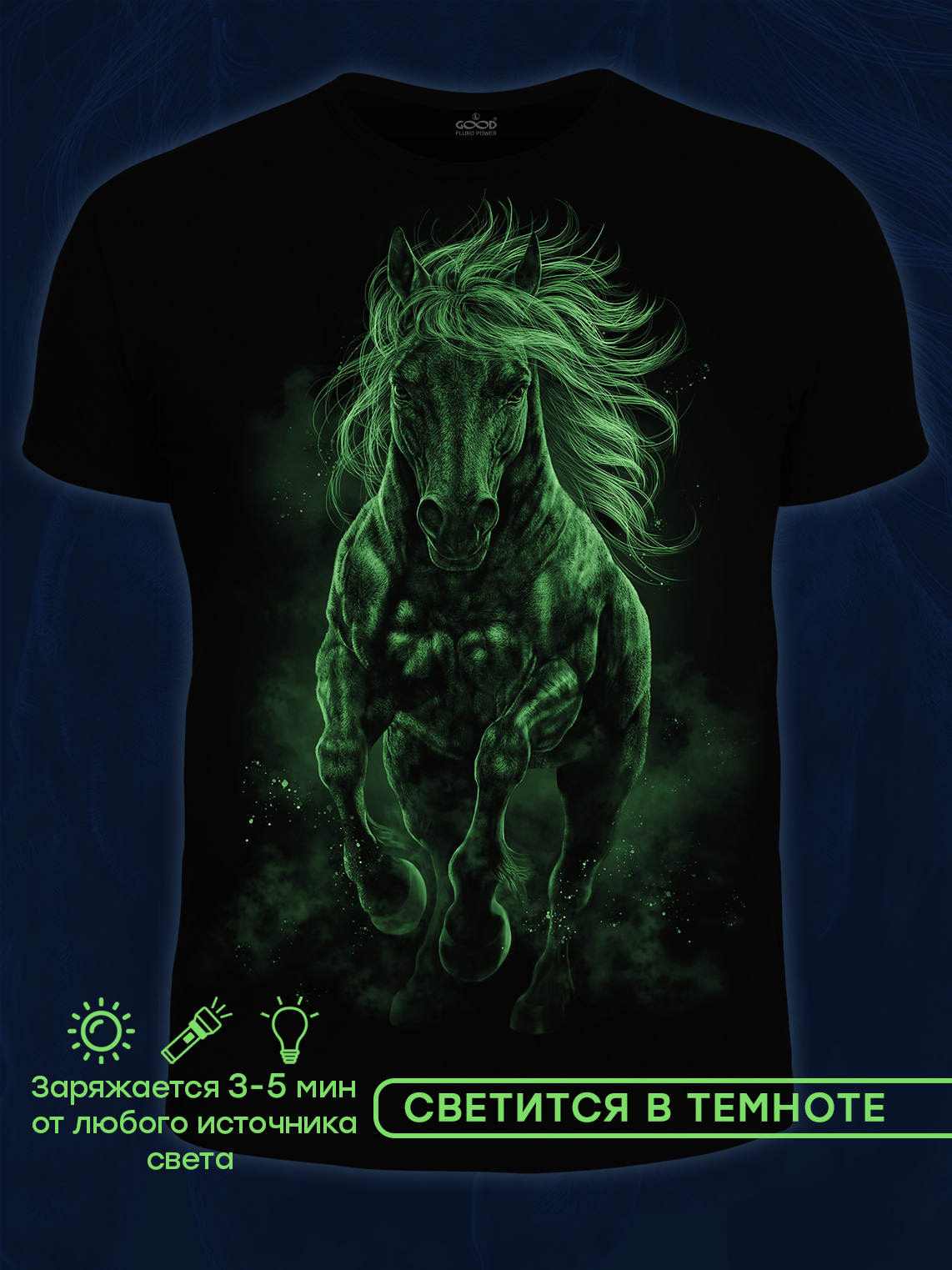 Мужская футболка марки "GOOD FLURO POWER" - создана из высококачественных тканей. Дизайн светится в темноте и ультрафиолете - заряжается на свету и взрывается яркими красками в клубе или кафе. Одежда специально разработана для всех, кто не стесняется выражать себя, ценит сочетание комфорта, яркого стиля и высокого качества в повседневной жизни и на вечеринке.