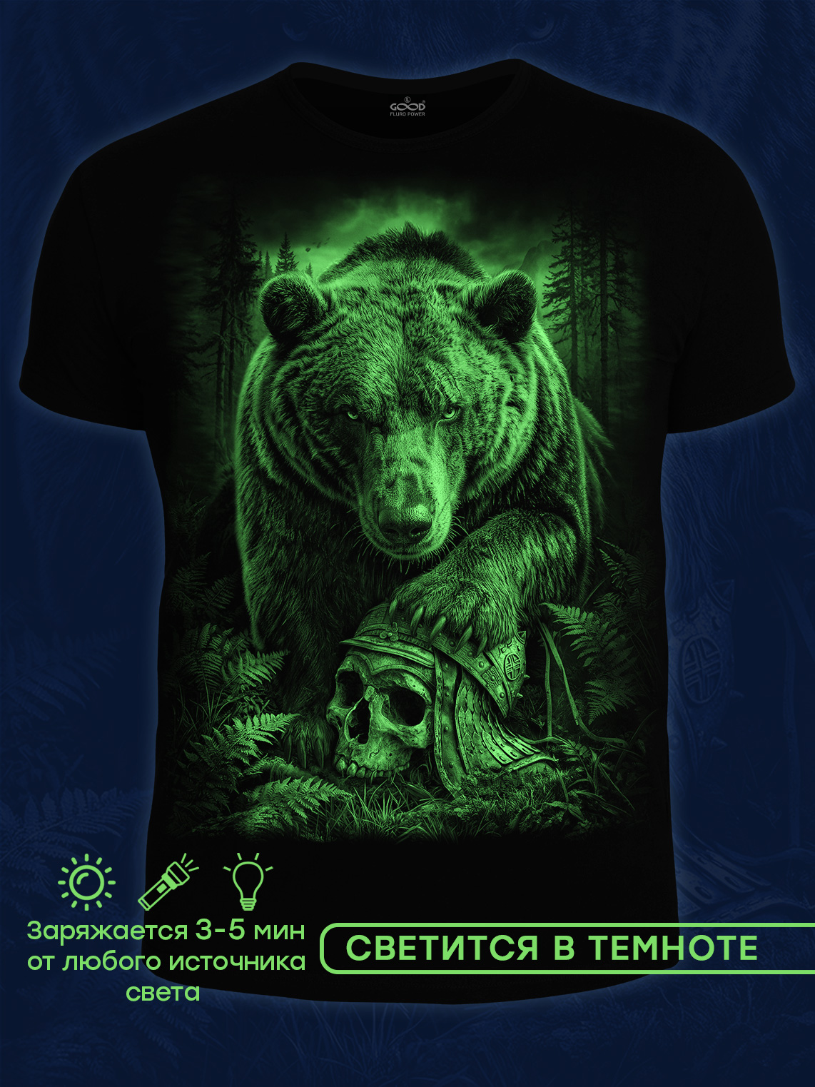 Мужская футболка марки "GOOD FLURO POWER" - создана из высококачественных тканей. Дизайн светится в темноте и ультрафиолете - заряжается на свету и взрывается яркими красками в клубе или кафе. Одежда специально разработана для всех, кто не стесняется выражать себя, ценит сочетание комфорта, яркого стиля и высокого качества в повседневной жизни и на вечеринке.