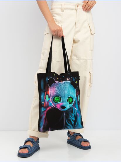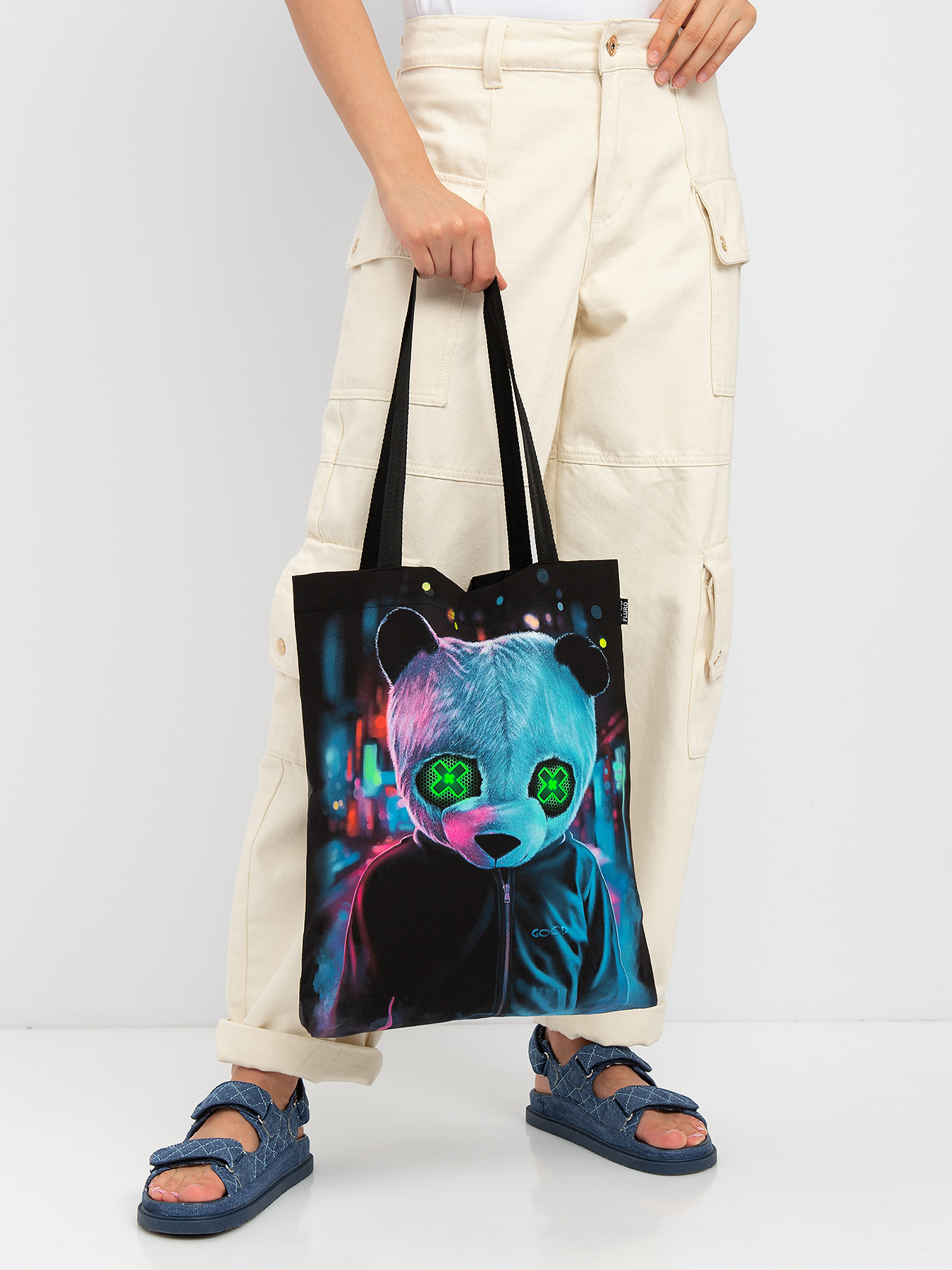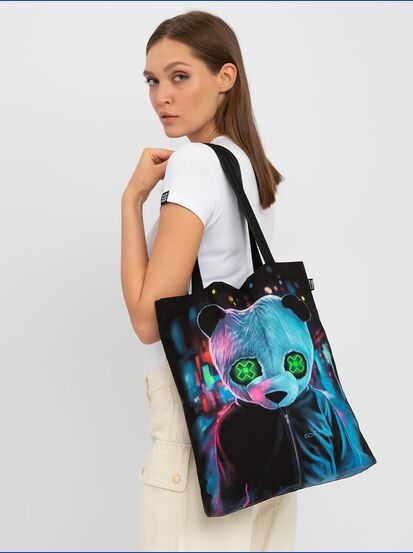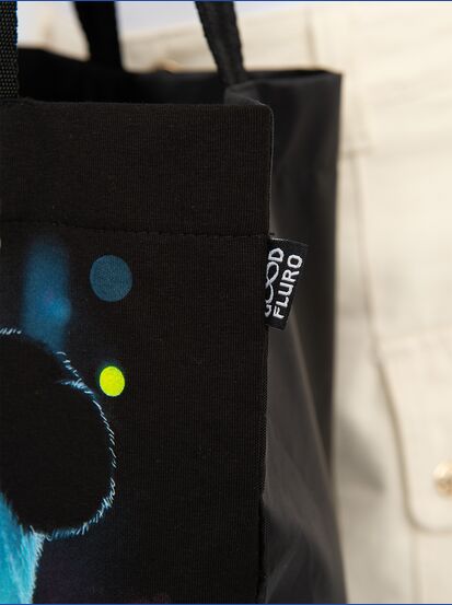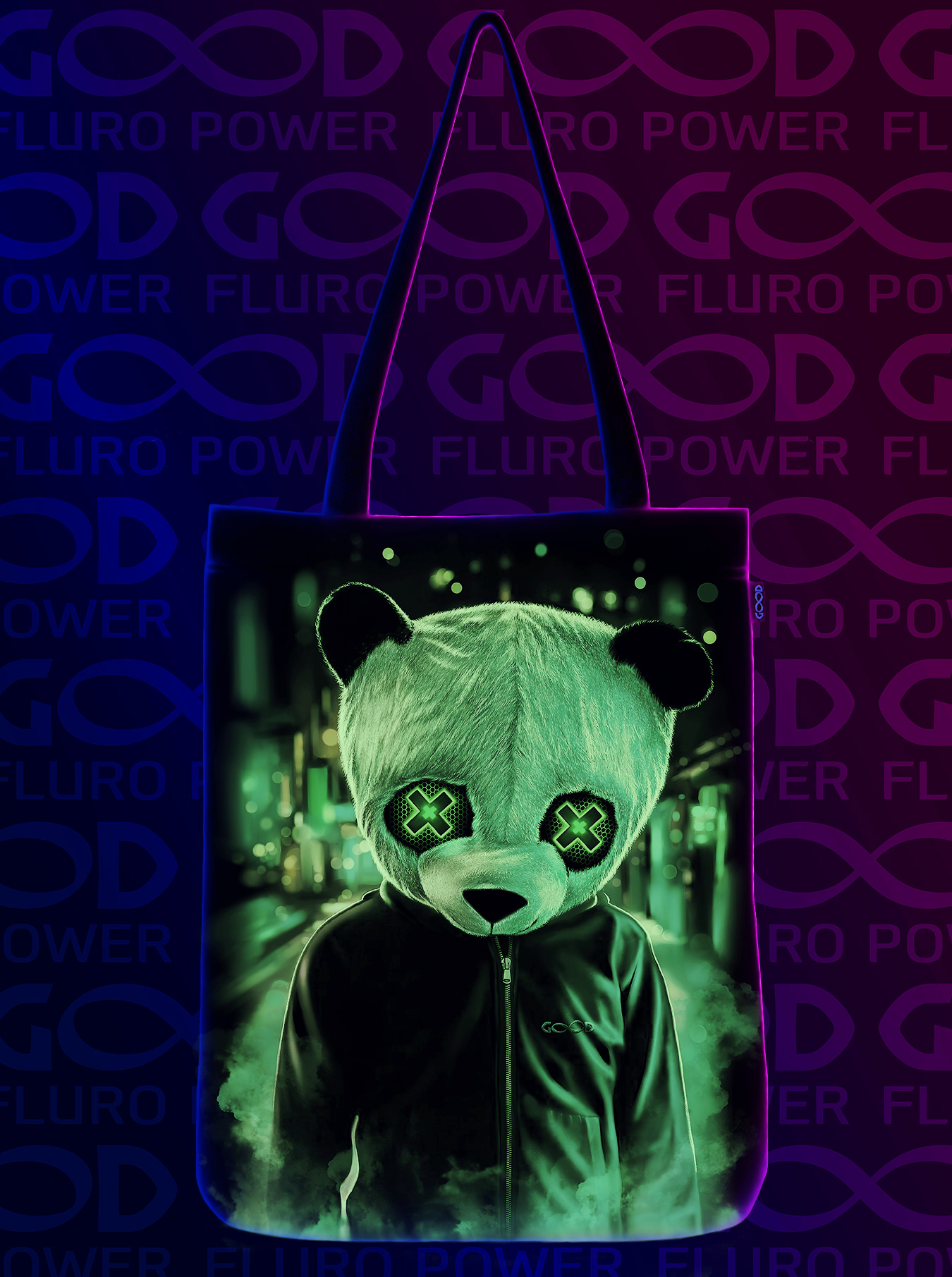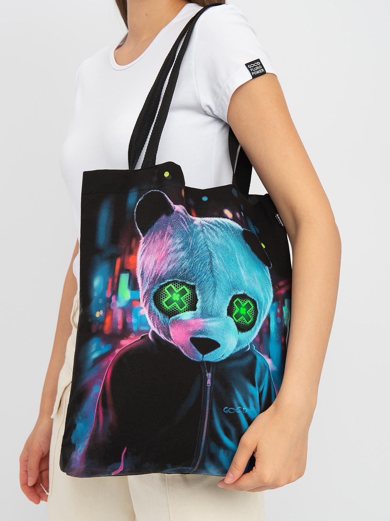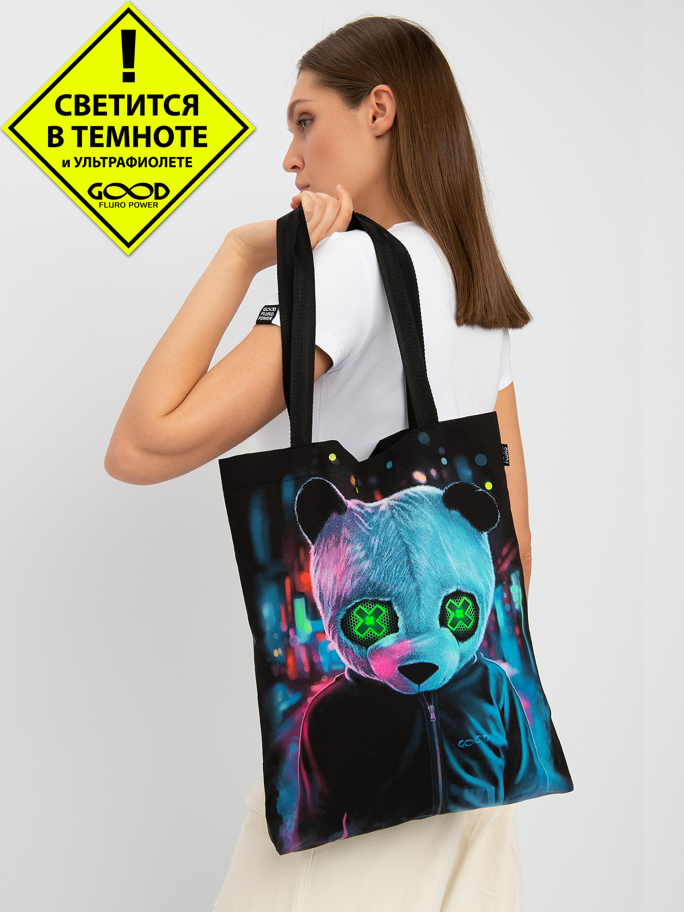 Cумка-шоппер "GOOD FLURO POWER" - создана из высококачественных тканей. Дизайн светится в темноте и ультрафиолете - заряжается на свету и взрывается яркими красками в клубе или кафе. Специально разработана для всех, кто не стесняется выражать себя, ценит сочетание комфорта, яркого стиля и высокого качества в повседневной жизни и на вечеринке.