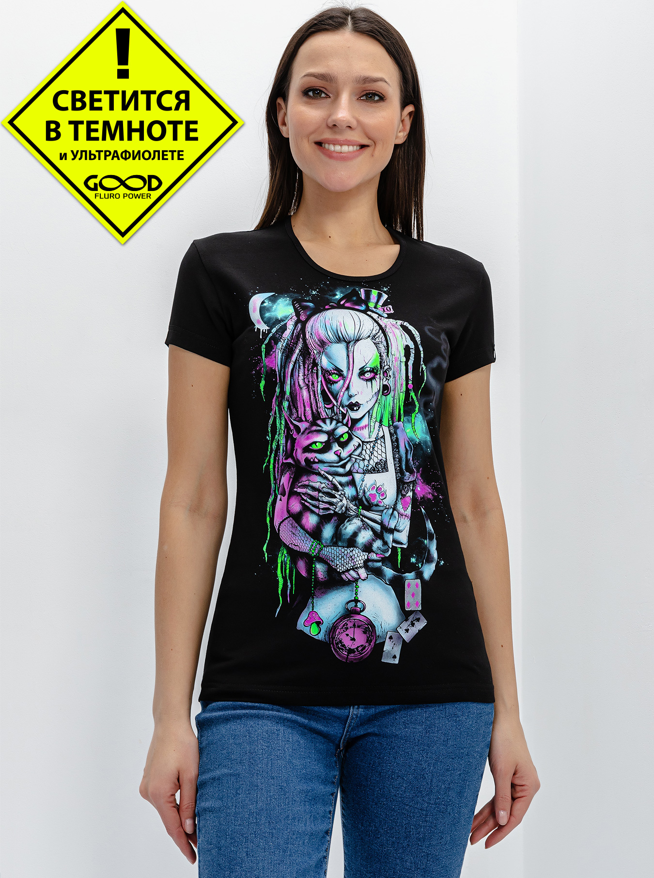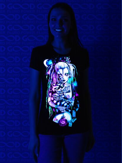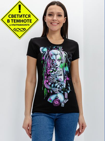 Женская футболка марки "GOOD FLURO POWER" - создана из высококачественных тканей. Дизайн светится в темноте и ультрафиолете - заряжается на свету и взрывается яркими красками в клубе или кафе. Одежда специально разработана для всех, кто не стесняется выражать себя, ценит сочетание комфорта, яркого стиля и высокого качества в повседневной жизни и на вечеринке.