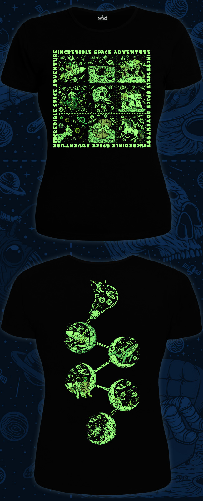 Женская футболка марки "GOOD FLURO POWER" - создана из высококачественных тканей. Дизайн светится в темноте и ультрафиолете - заряжается на свету и взрывается яркими красками в клубе или кафе. Одежда специально разработана для всех, кто не стесняется выражать себя, ценит сочетание комфорта, яркого стиля и высокого качества в повседневной жизни и на вечеринке.